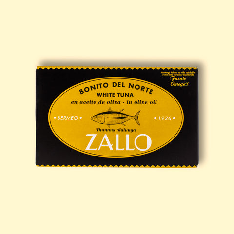 Albacore tuna in olive oil. This delicately flavoured white tuna is caught in the Cantabrian Sea and tinned in the Basque Country on the day of catch. The Bonito del Norte is caught in the summer months when it swims close to the Cantabrian coast and is at its best. Zallo is an eco-friendly cannery. It works with the Marine Stewardship Council and its tuna is caught pole-and-line fishing which means there is no by-catch or seabed damage.