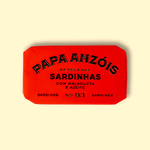 Sardines fished off the Algarve and canned close to the river Arade in Southern Portugal, in spicy virgin olive oil. Papa Anzóis signature dehydration process results in a juicier, more omega-3 rich sardine. The incredibly succulent fish is complemented with high quality virgin olive oil and red chilli which are locally sourced. The artisanal methods, the very small team and the low production runs mean the cannery is the only certified "by hand" cannery in mainland Portugal. The name Papa Anzóis is a whimsical one. It comes from a map given to cannery owners Manuel Mendes and Vincent Jonckheere by a customer. The map shows the locations of sea bed rock formations along the Algarve coast. The rocks are where fish congregate and Papa Anzóis - which translates as the rock that eats fish hooks - is a notoriously tricky one.